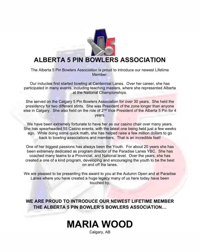 Congratulations to Maria Wood on her lifetime membership to the Alberta 5 Pin Bowlers’ Association. The award was presented to Maria at the Autumn Open (Paradise Lanes) Thanksgiving weekend 2024.